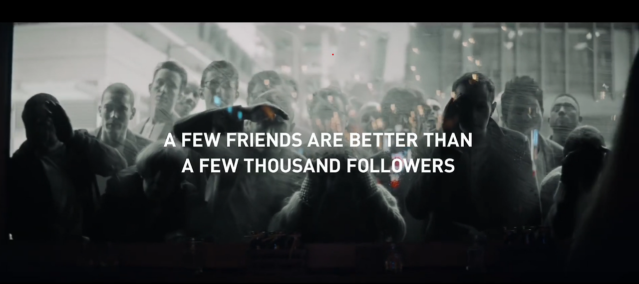 광고를 보셨는가? (혹시 못 보셨다면, 꼭 바로 위에 있는 링크를 클릭해 광고를 시청해보시길 바란다. 1분이 조금 넘는 짧은 광고다.) 어떤 생각이 드시는가? 광고의 주인공은 처음부터 수많은 사람들에게 쫓긴다. 잘 보면, 그 사람들은 주인공과 똑같은 옷을 입고 있다. 다른 주인공들도 자신과 똑같은 옷과 화장을 한 사람들에게 쫓겨 도망간다. 도망가는 순간순간 보여주는 식당에서는 자신이 주문한 음식을 먹지 않고 사진으로만 열심히 찍는 사람들이 나온다. 막다른 골목에 몰린 주인공은 Bar이라고 쓰인 술집 간판을 보고, 사람들의 신발과 자신의 신발을 번갈아 바라본다. 같은 신발을 신고 있음을 보고, 주인공은 자신의 신발을 벗어 그들에게 던진다. 그 신발을 갖기 위한 사람들의 쟁탈전이 시작된다. 누군가 그 신발을 얻어 기뻐한다. 주인공은 웃는 얼굴로 자신을 기다리고 있던 친구들을 만난다. 창문 밖에는 아까 주인공을 따라오던 수많은 사람들이 창문을 통해 주인공을 바라보고 있다. 그리고는 볼드체와 대문자로 문구가 나타난다. "A FEW FRIENDS ARE BETTERN THAN A FEW THOUSAND FOLLOWERS", "HERE'S TO THE ORIGINAL SOCIAL MEDIA" (몇 명의 친구가 수천 명의 팔로워보다 낫습니다, 자! 여기 진짜 소셜 미디어가 있습니다)