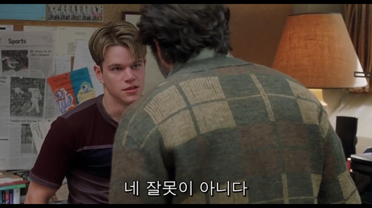 정신과 의사 숀과 수학 천재 윌은 비슷한 아픔을 가지고 있다. 보스턴 남부출신이라는 인정받지 못할 출생지역 성분, 아버지로부터의 아동학대를 견디어야 했던 지옥같은 어린 시절. 하지만 숀과 윌은 같아보이지만 다른 성격을 보이는데. 윌은 양아버지에 의해 폭력의 아동학대를 당하고, 그런 현실을 그대로 인정하고, 의지와 선택을 포기하는 형태를 보인다. 그래서 윌은 폭력을 행사하는 아버지에 대해 반항하지 못하고 무엇으로 맞을 것인지 선택하는 행동을 보이는 것이다. 한마디로 윌은 자기가 지금 처한 현실은, 아버지로부터 구타를 당하는 것은 모두 '나의 책임이다'라는 인식에 의한 것이다. 이것은 '가정폭력'에서도 비슷한 양상을 보이는데, 언어폭력으로 시작된 가정폭력은, 물리적 폭력으로 변하고, 이의 주된 원인은 가해자의 특성보다 피해자의 폭력에 대한 점차적인 익숙화, 무감각화 되어 구타의 원인을 자기의 탓으로 돌리는 특성으로 가해자로 하여금 폭력을 정당화시키는 결과를 낳을수 있다는 것이다.