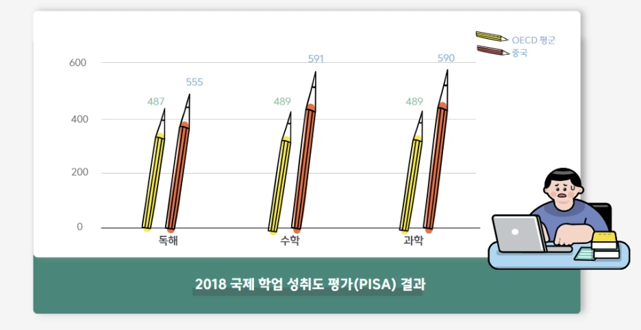 OECD는 3년마다 각국 학생들의 학업 성취도 평가(PISA)를 발표하는데 중국은 지금까지 총 4번(2009,2012,2015,2018) 평가에 참여했고 세 차례나 세계 1위를 차지했다. 사교육에 대한 철퇴는 더욱 거세지고 공교육에 종사하는 교사들의 밥그릇은 위태로워진 상황에서 다음번에 중국이 받게 될 PISA 결과는 어떻게 될까.