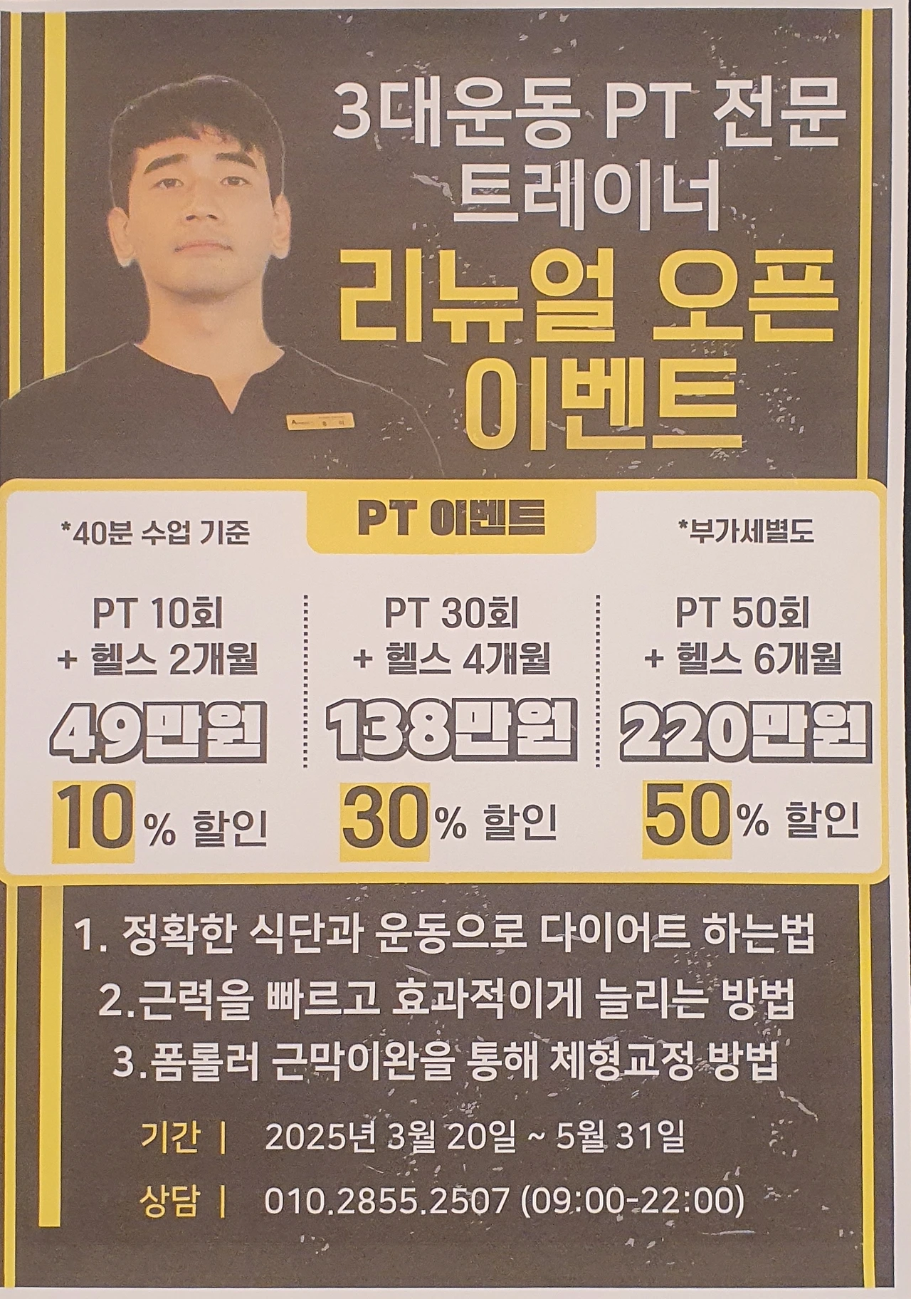 아 그리고 이걸 보고 오시는 분들에게 PT 50회 특별 가격이 있다고 하니 카운터에서 꼭 물어보시길 바랍니다.