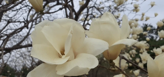 하얀 목련꽃이 이제 투박한 외투를 벗고