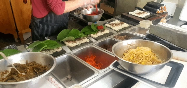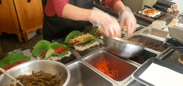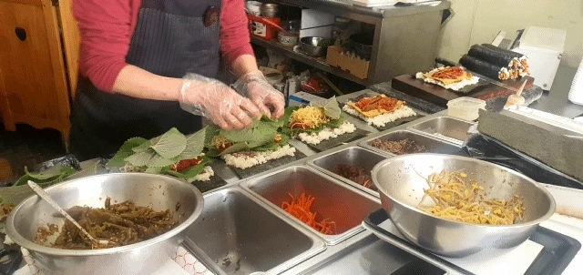 나는 시그니처 메뉴인 시래기 김밥과 시래기 고추 김밥 두 가지를 주문했다. 사장님은 김 두 장을 꺼내 바로 김밥 쌀 준비를 하신다.