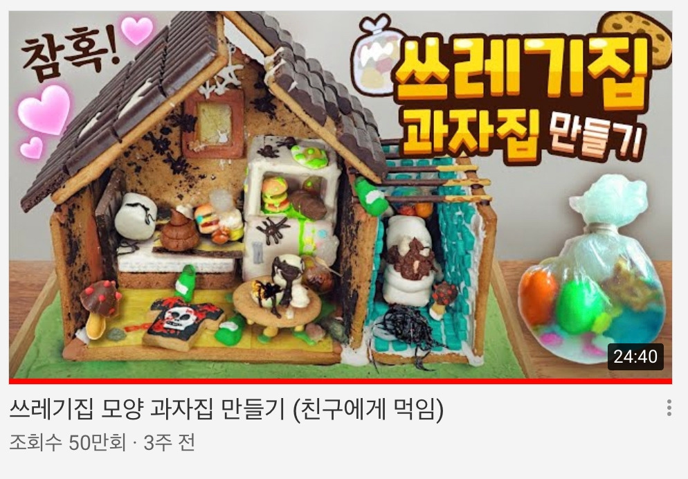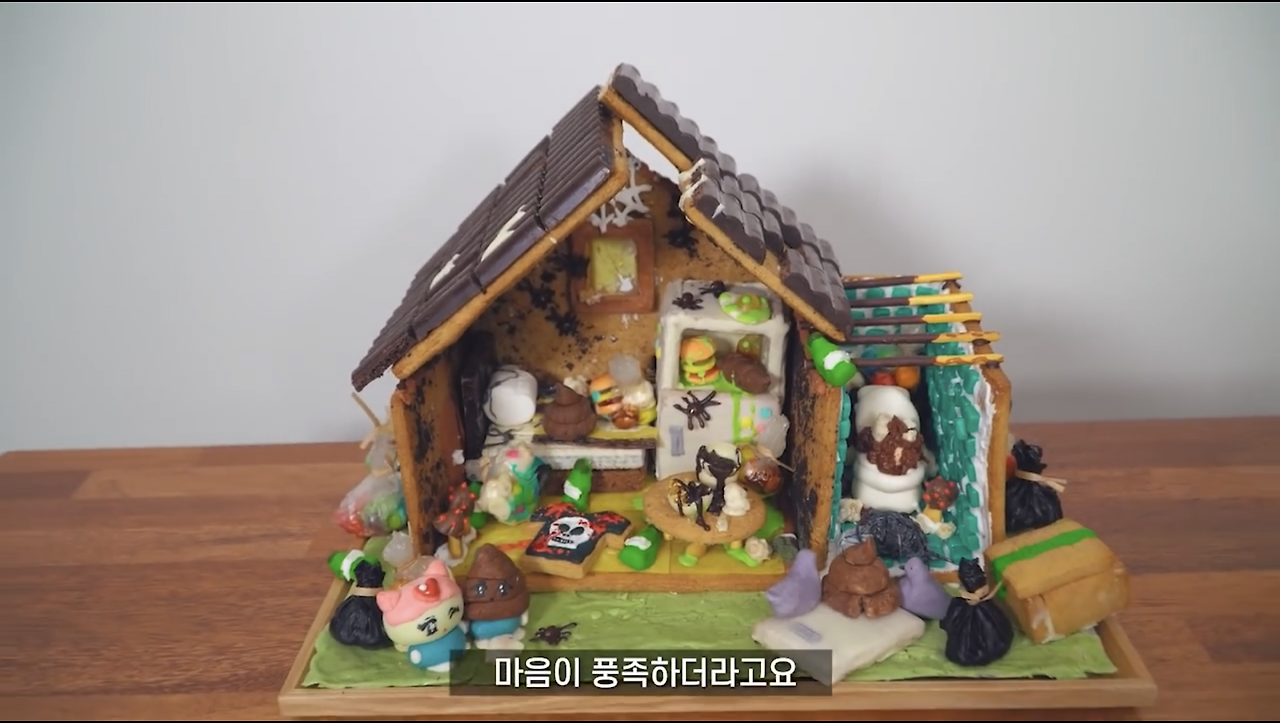 1화인 '쓰레기집 만들기' 편에서는 '유통기한 임박몰'에서 과자를 사서, 과자 쓰레기집을 만들었습니다.
