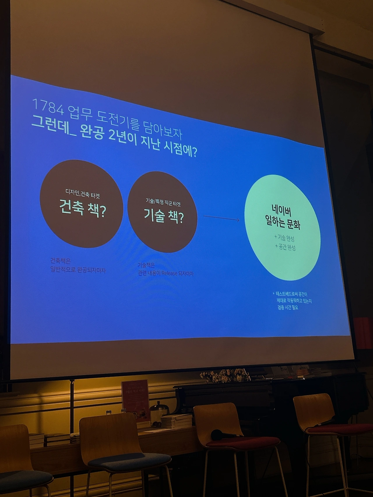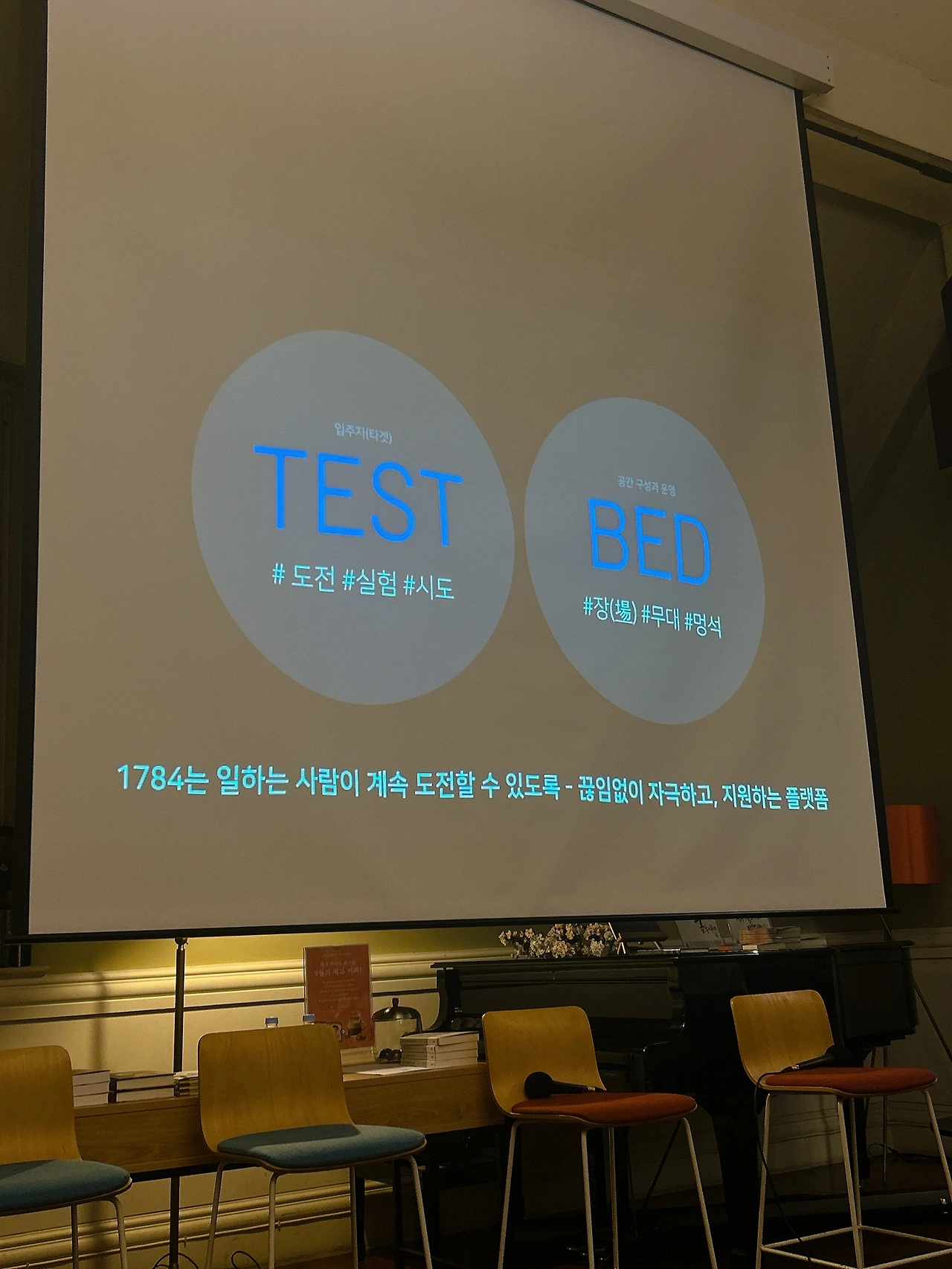 어느 날의 저녁. 서점의 묵직한 공기를 깨고 북토크의 문이 열렸다. 1부는 네이버의 인터널브랜딩을 담당하는 강새봄 연사님의 <1784 THE TESTBED> 소개로 시작됐다. 책의 제목이자 동시에 네이버 제2 사옥의 이름.