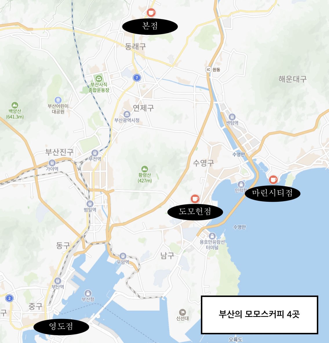 지도로 살펴보니 만약 다음에 부산에 온다면 아예 모모스커피로만 투어를 해도, 충분한 부산 여행이 될 것 같았다. 그 정도로 부산 곳곳에 넓게 퍼져있다. 우리는 그저 모모스커피가 좋아서 그들을 따라다닐 뿐인데, 자연스럽게 부산의 로컬 구석구석을 여행할 수 있게 된다. 남들이 가니까 따라가는 광안리, 해운대 말고. 영도항, 온천장처럼 정말 사람들이 살고 있는 부산의 진짜 모습을 마주하게 된다. 흔한 오션뷰 한 장 없이도 그 깊숙한 골목까지 방문객을 이끌게 하는 힘이다.