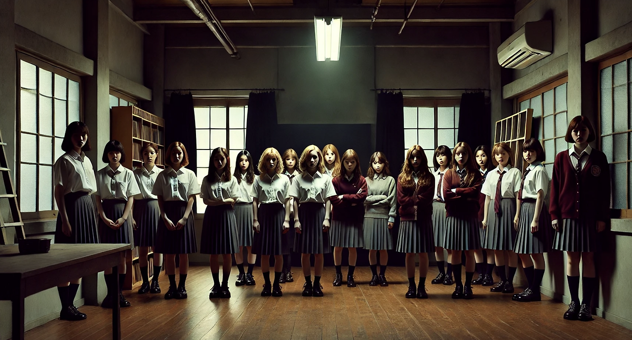 그때, 다섯 명의 소녀들이 실기실로 들어왔다. 그들은 무표정한 얼굴로 한 걸음 한 걸음 천천히 다가왔고, 마치 공간의 공기를 쥐고 있는 듯한 긴장감이 흘렀다. 한 소녀가 문 옆 벽에 있던 스위치를 내리자, 실내는 한순간에 어둑해졌다. 창문 틈새로 들어오던 햇빛은 사라지고, 차가운 공기가 소녀들의 피부를 스치며 오싹한 느낌을 주었다. 지아는 재빨리 그들의 수를 셌다. 다섯 명이었다. 그들 중 한 명이 살짝 앞서 있었고, 나머지는 자연스럽게 그 뒤를 따르고 있었다. 다섯 명이었다.