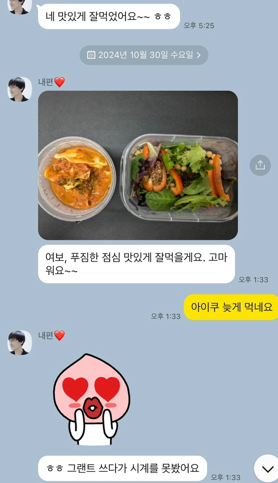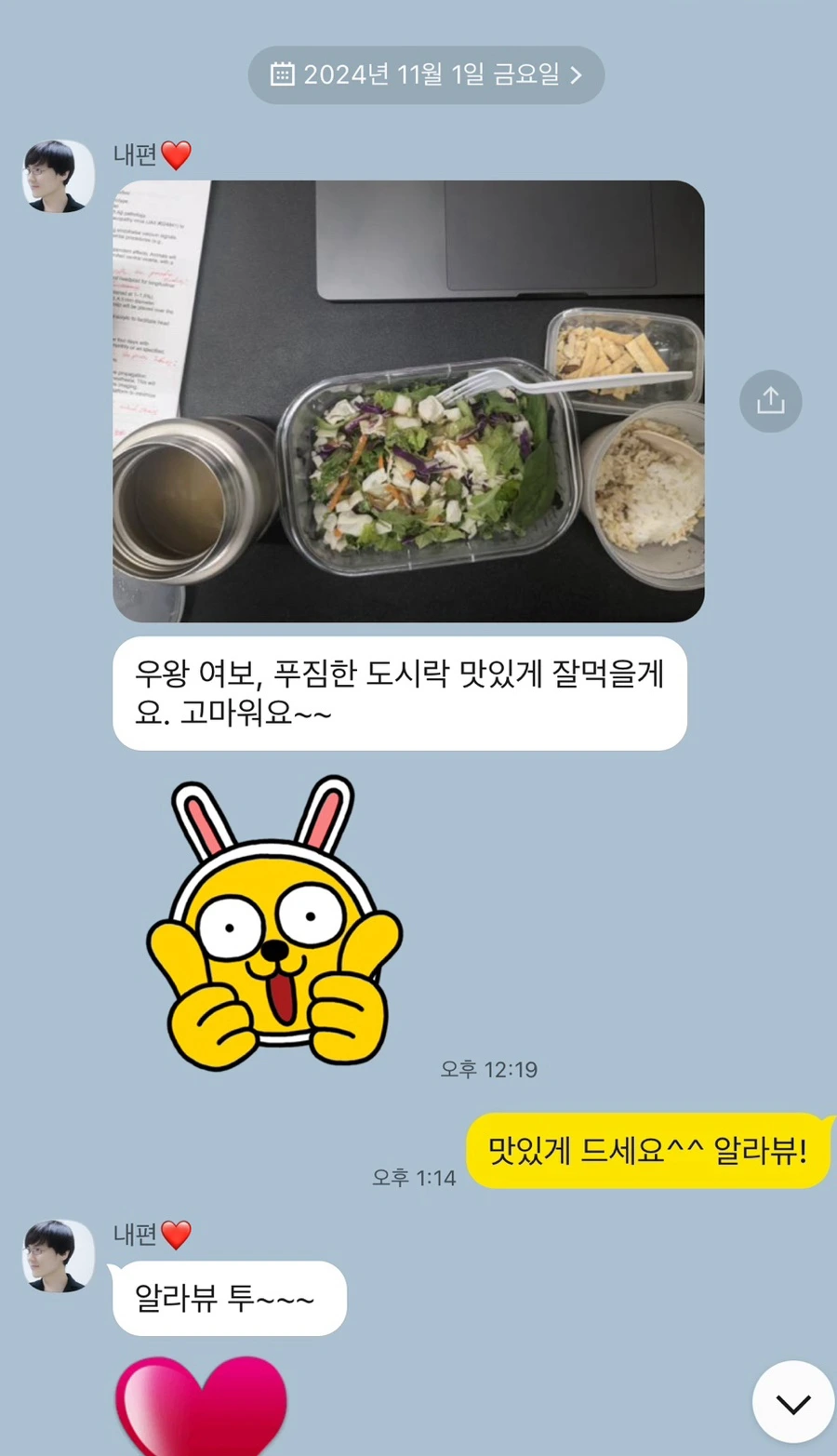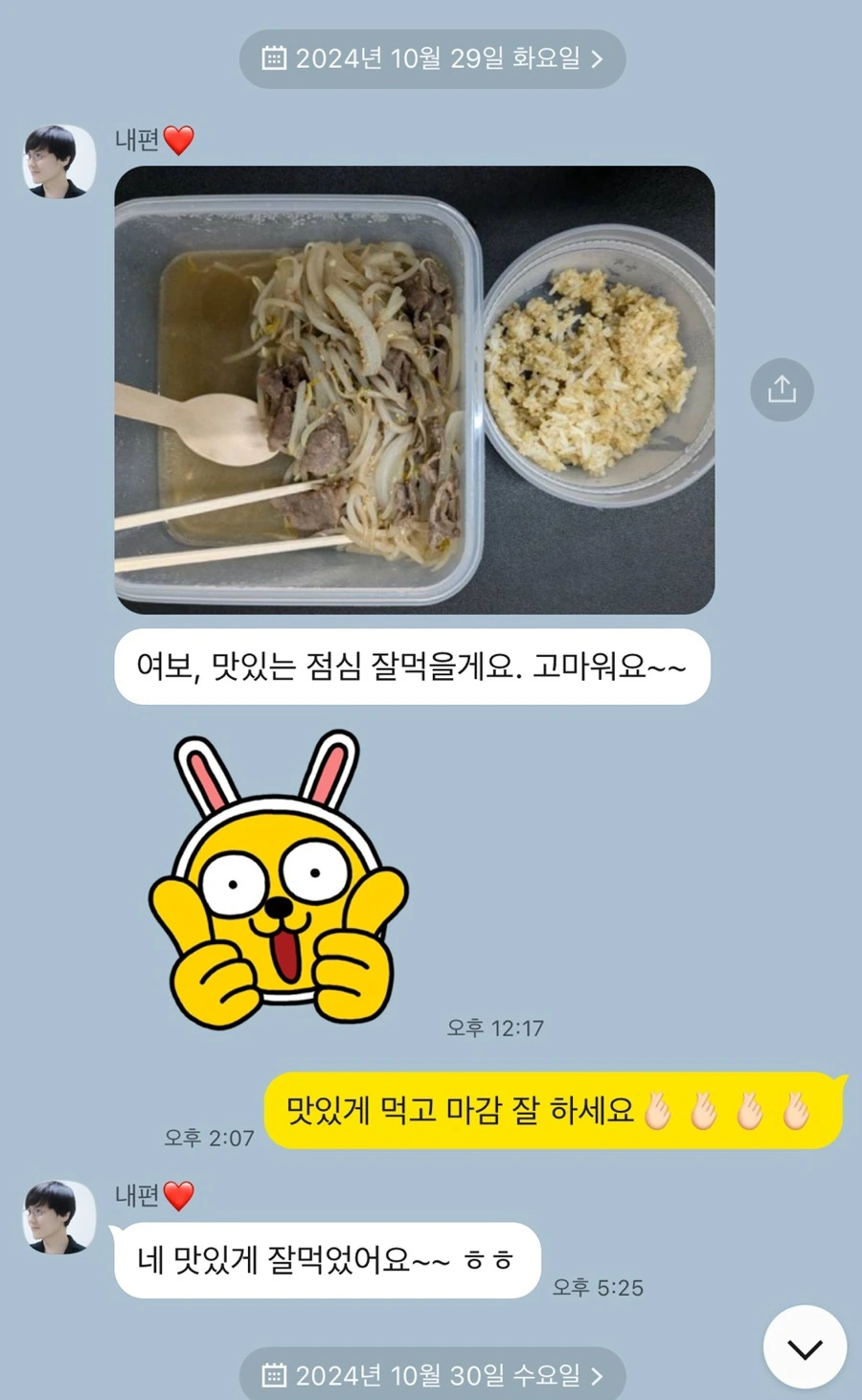 저녁에 같이 밥을 먹으면서도 도시락 이야기로 자연스럽게 대화가 이어진다. 내가 “오늘 반찬 어땠어?”라며 물으면, 남편은 “그거 진짜 맛있었어요!”라고 웃으며 대답한다.