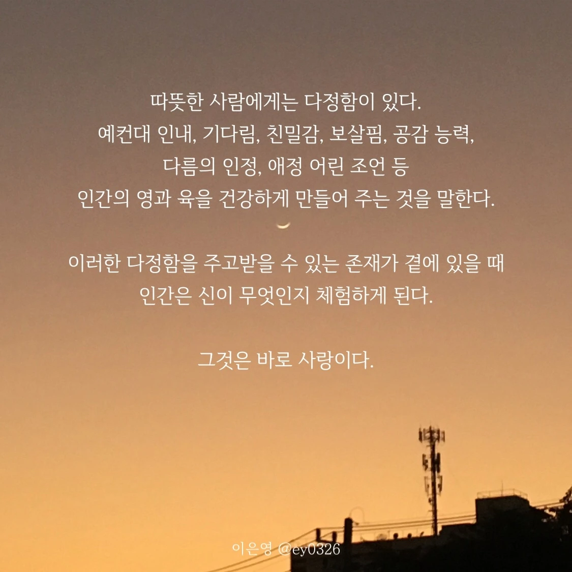 +사랑하지 않는 사람은 하느님을 알지 못합니다. 하느님은 사랑이시기 때문입니다. (1요한 4, 8)