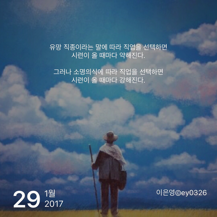유망 직종이라는 말에 따라 직업을 선택하면 시련이 올 때마다 약해진다.그러나 소명 의식에 따라 직업을 선택하면 시련이 올 때마다 강해진다.