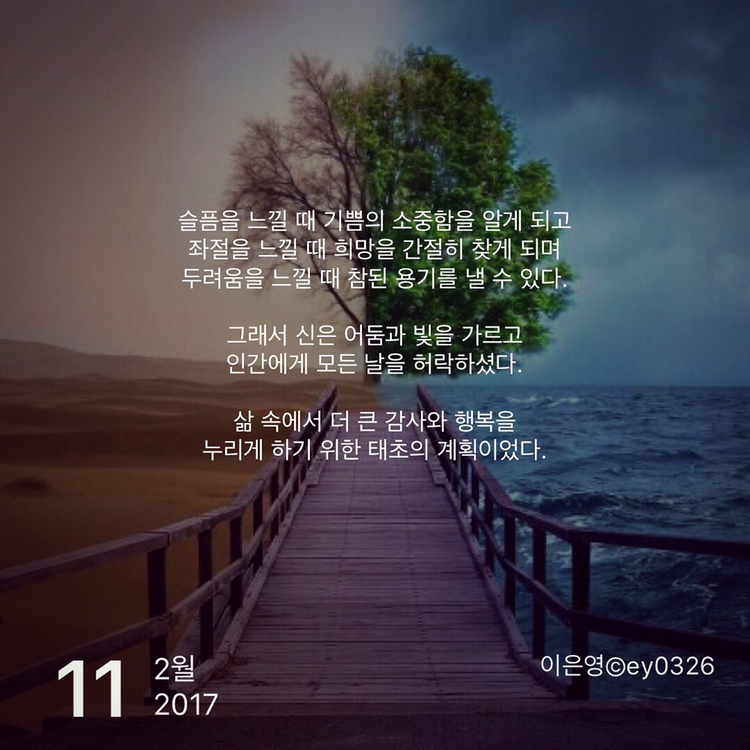 슬픔을 느낄 때 기쁨의 소중함을 알게 되고좌절을 느낄 때 희망을 간절히 찾게 되며두려움을 느낄 때 참된 용기를 낼 수 있다.그래서 신은 어둠과 빛을 가르고인간에게 모든 날을 허락하셨다.삶 속에서 더 큰 감사와 행복을누리게 하기 위한 태초의 계획이었다.