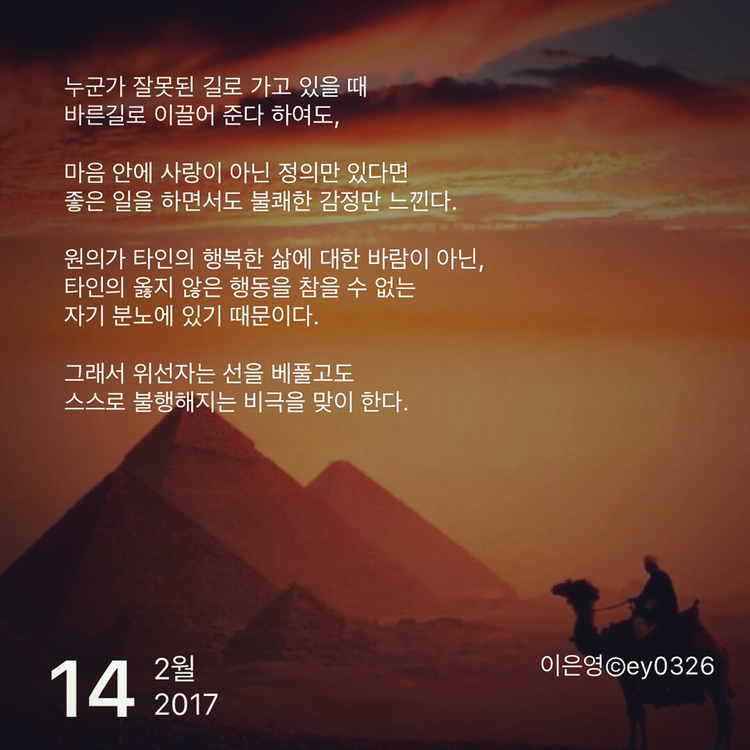 누군가 잘못된 길로 가고 있을 때바른길로 이끌어 준다 하여도,마음 안에 사랑이 아닌 정의만 있다면좋은 일을 하면서도 불쾌한 감정만 느낀다.원의가 타인의 행복한 삶에 대한 바람이 아닌,타인의 옳지 않은 행동을 참을 수 없는 자기 분노에 있기 때문이다.그래서 위선자는 선을 베풀고도 스스로 불행해지는 비극을 맞이 한다.
