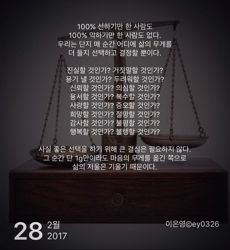 그 순간 단 1g만이라도 마음의 무게를 옮긴 쪽으로 삶의 저울은 기울기 때문이다.