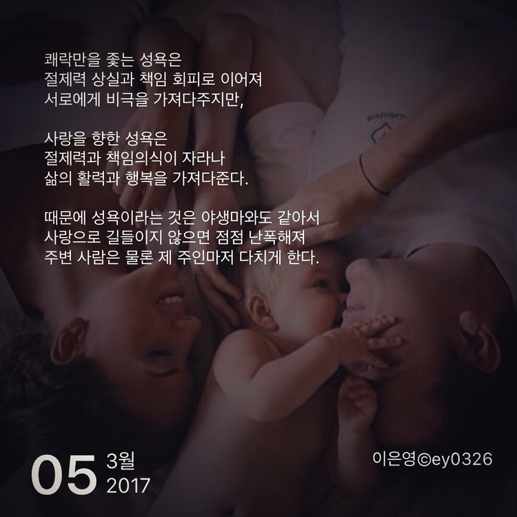 쾌락만을 좇는 성욕은 절제력 상실과 책임 회피로 이어져서로에게 비극을 가져다주지만,사랑을 향한 성욕은 절제력과 책임의식이 자라나삶의 활력과 행복을 가져다준다.때문에 성욕이라는 것은 야생마와도 같아서 사랑으로 길들이지 않으면 점점 난폭해져주변 사람은 물론 제 주인마저 다치게 한다.