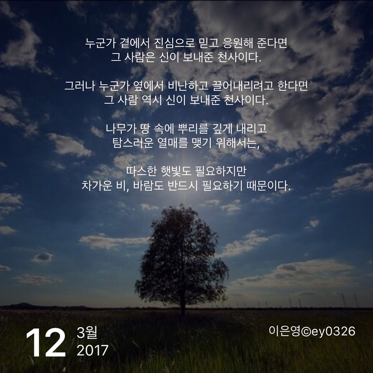 누군가 곁에서 진심으로 믿고 응원해 준다면그 사람은 신이 보내준 천사이다.그러나 누군가 옆에서 비난하고 끌어내리려고 한다면 그 사람 역시 신이 보내준 천사이다.나무가 땅 속에 뿌리를 깊게 내리고 탐스러운 열매를 맺기 위해서는,따스한 햇빛도 필요하지만 차가운 비, 바람도 반드시 필요하기 때문이다.