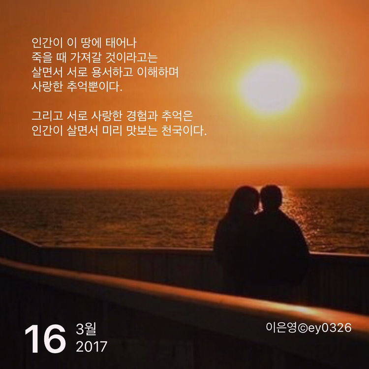인간이 이 땅에 태어나죽을 때 가져갈 것이라고는살면서 서로 용서하고 이해하며사랑한 추억뿐이다.그리고 서로 사랑한 경험과 추억은인간이 살면서 미리 맛보는 천국이다.