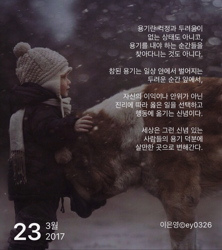 용기란 걱정과 두려움이 없는 상태도 아니고,용기를 내야 하는 순간들을 찾아다니는 것도 아니다.참된 용기는 일상 안에서 벌어지는두려운 순간 앞에서, 자신의 이익이나 안위가 아닌진리에 따라 옳은 일을 선택하고 행동에 옮기는 신념이다.세상은 그런 신념 있는 사람들의 용기 덕분에살만한 곳으로 변해간다.