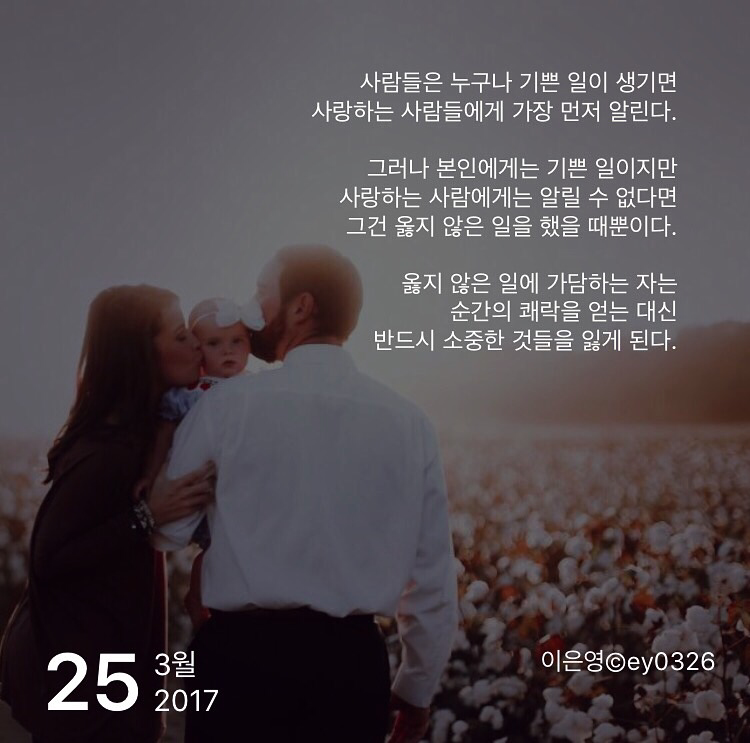 사람들은 누구나 기쁜 일이 생기면 사랑하는 사람들에게 가장 먼저 알린다.그러나 본인에게는 기쁜 일이지만사랑하는 사람에게는 알릴 수 없다면그건 옳지 않은 일을 했을 때뿐이다.옳지 않은 일에 가담하는 자는순간의 쾌락을 얻는 대신 반드시 소중한 것들을 잃게 된다.