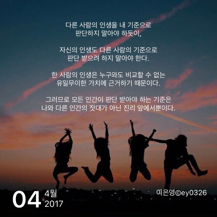 다른 사람의 인생을 내 기준으로판단하지 말아야 하듯이,자신의 인생도 다른 사람의 기준으로판단 받으려 하지 말아야 한다.한 사람의 인생은 누구와도 비교할 수 없는유일무이한 가치에 근거하기 때문이다.그러므로 모든 인간이 판단 받아야 하는 기준은 나와 다른 인간의 잣대가 아닌 진리 앞에서뿐이다.