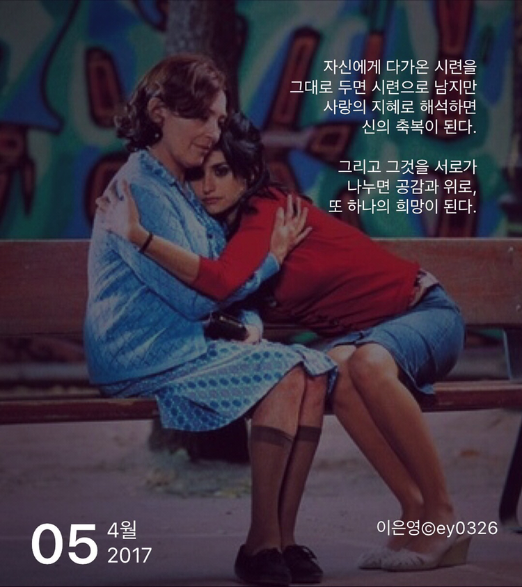 자신에게 다가온 시련을그대로 두면 시련으로 남지만 사랑의 지혜로 해석하면신의 축복이 된다.그리고 그것을 서로가 나누면 공감과 위로,또 하나의 희망이 된다.