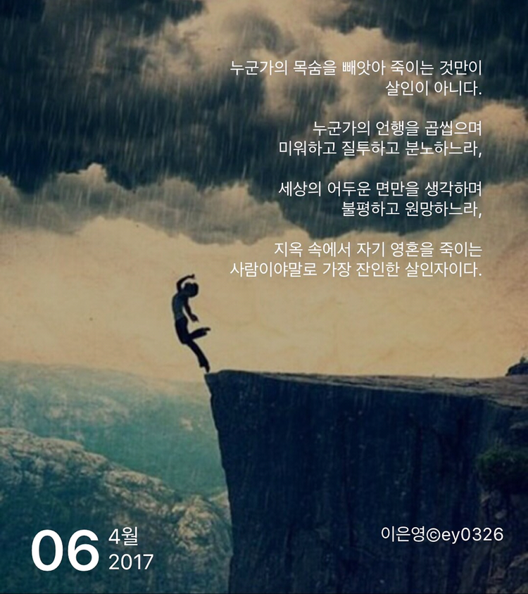 누군가의 목숨을 빼앗아 죽이는 것만이살인이 아니다.누군가의 언행을 곱씹으며미워하고 질투하고 분노하느라,세상의 어두운 면만을 생각하며불평하고 원망하느라,지옥 속에서 자기 영혼을 죽이는 사람이야말로 가장 잔인한 살인자이다.