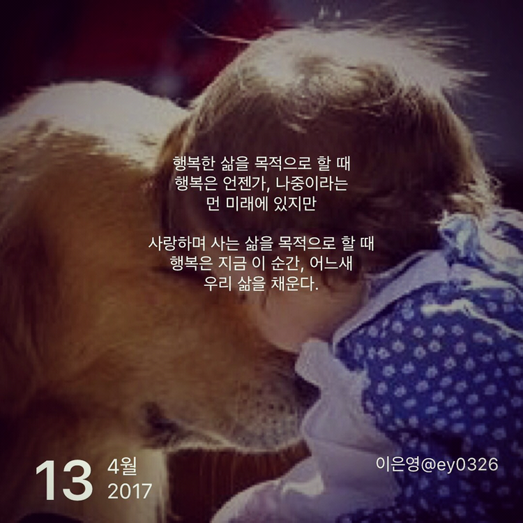 행복한 삶을 목적으로 할 때행복은 언젠가, 나중이라는먼 미래에 있지만사랑하며 사는 삶을 목적으로 할 때행복은 지금 이 순간, 어느새 우리 삶을 채운다.