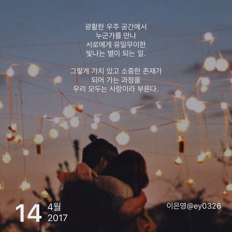 광활한 우주 공간에서 누군가를 만나서로에게 유일무이한 빛나는 별이 되는 일.그렇게 가치 있고 소중한 존재가 되어 가는 과정을 우리 모두는 사랑이라 부른다.