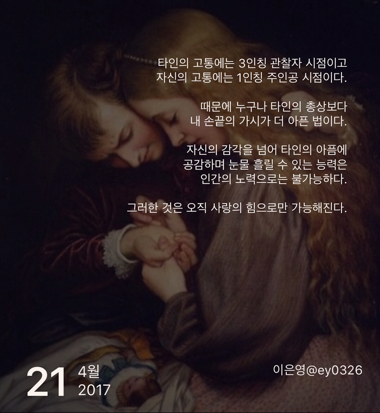 타인의 고통에는 3인칭 관찰자 시점이고자신의 고통에는 1인칭 주인공 시점이다.때문에 누구나 타인의 총상보다 내 손끝의 가시가 더 아픈 법이다.해서 자신의 감각을 넘어 타인의 아픔에 공감하며 함께 눈물 흘릴 수 있는 능력은인간의 노력으로는 불가능하다.그러한 것은 오직 사랑의 힘으로만 가능해진다.