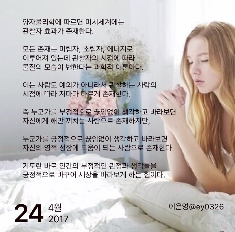 기도란 바로 인간의 부정적인 관점과 생각들을 긍정적으로 바꾸어 세상을 바라보게 하는 힘이다.