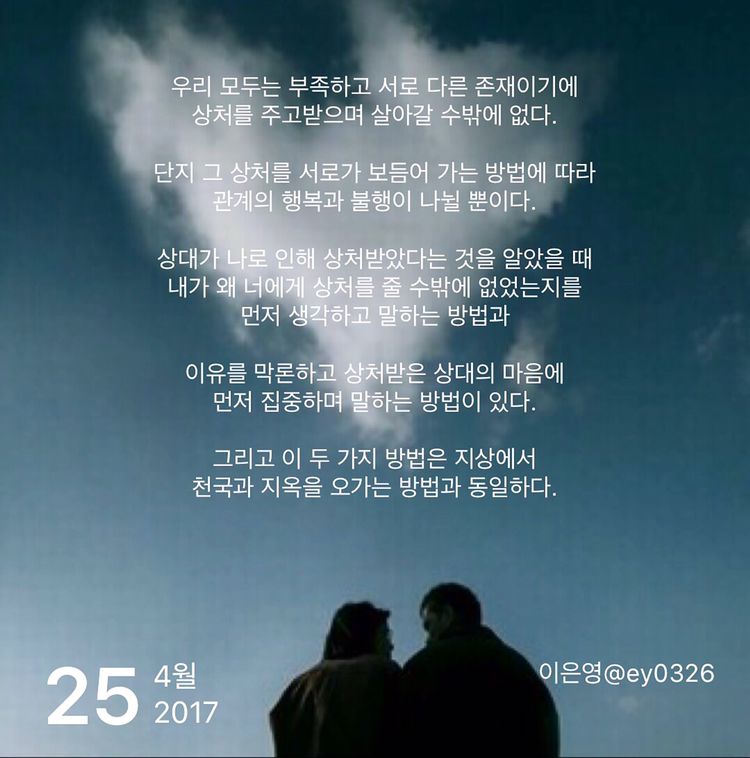 우리 모두는 부족하고 서로 다른 사람들이기에 상처를 주고받으며 살아갈 수밖에 없다.