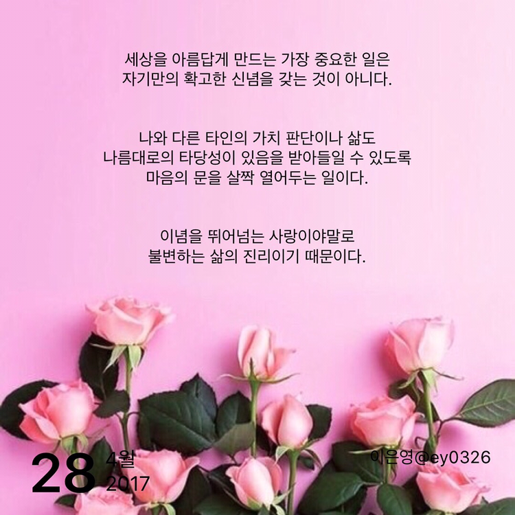 세상을 아름답게 만드는 가장 중요한 일은자기만의 확고한 신념을 갖는 것이 아니다.나와 다른 타인의 가치 판단이나 삶도 나름대로의 타당성이 있음을 받아들일 수 있는 마음의 문을 살짝 열어두는 일이다.이념을 뛰어넘는 사랑이야말로삶의 진리이기 때문이다.