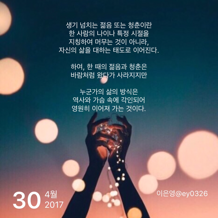 생기 넘치는 젊음 또는 청춘이란한 사람의 나이나 특정 시절을지칭하여 머무는 것이 아니라,자신의 삶을 대하는 태도로 이어진다.하여, 한 때의 젊음과 청춘은 바람처럼 왔다가 사라지지만누군가의 삶의 방식은 역사와 가슴 속에 각인되어영원히 이어져 가는 것이다.