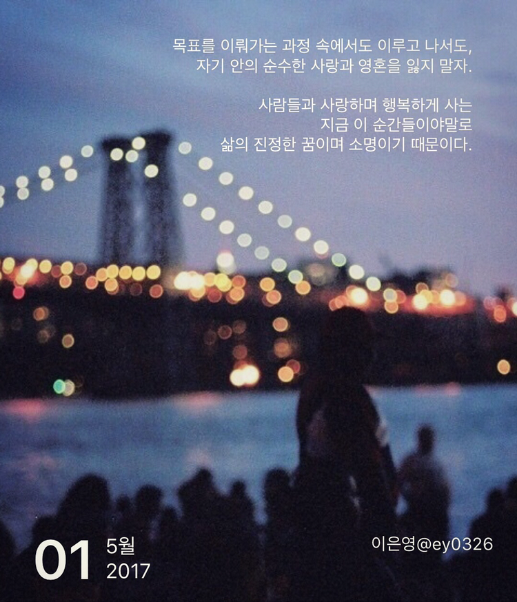 너무 심각하게 기를 쓰고 애쓰며 살지 않아도 된단다. 네가 목표를 향해 달려가면서도 행복하다 느껴지지 않을 때 | 사랑하는 얘야. 삶의 무게가 네 어깨를 짓누르기 시작할 때, 지금의 말들을 기억했으면 좋겠구나. 인생은 축제란다. 그러니 너무 심각하게 기를 쓰고 애쓰며 살지 않아도 된단다. 훌륭해 보이는 일을 이루기 위한 삶이 인생의 목표가 되지 않도록 주의하여라. 인생에 수많은 의미를 부여하며 세운 큰 목표가 때론 스스로를 불행하게 만드는 족쇄가 될 수 있다. 네가