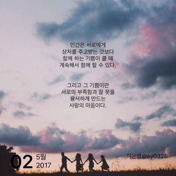인간은 서로에게 상처를 주고받는 것보다 함께 하는 기쁨이 클 때 계속해서 함께 할 수 있다.그리고 그 기쁨이란서로의 부족함과 잘 못을 용서하게 만드는사랑의 마음이다.