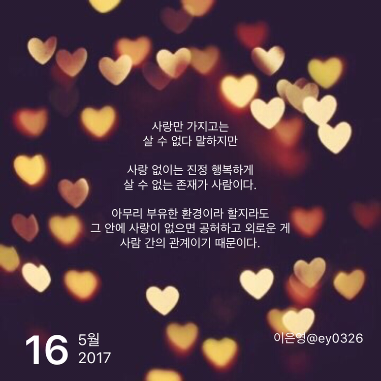 사랑만 가지고는 살 수 없다 말하지만사랑 없이는 진정 행복하게살 수 없는 존재가 사람이다.아무리 부유한 환경이라 할지라도그 안에 사랑이 없으면 공허하고 외로운 게 사람 간의 관계이기 때문이다.