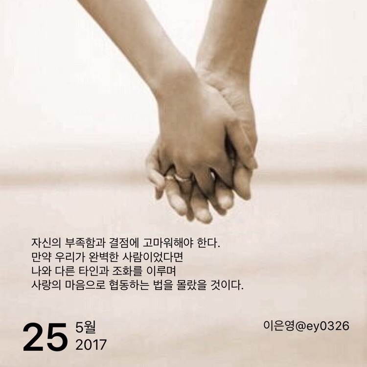 자신의 부족함과 결점에 고마워해야 한다.만약 우리가 완벽한 사람이었다면나와 다른 타인과 조화를 이루며사랑의 마음으로 협동하는 법을 몰랐을 것이다.