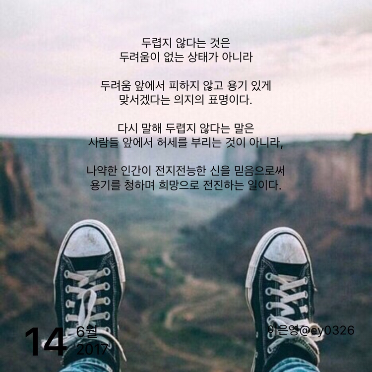 두렵지 않다는 것은두려움이 없는 상태가 아니라두려움 앞에서 피하지 않고 용기 있게 맞서겠다는 의지의 표명이다.다시 말해 두렵지 않다는 말은 사람들 앞에서 허세를 부리는 것이 아니라,나약한 인간이 전지전능한 신을 믿음으로써용기를 청하며 희망으로 전진하는 일이다.