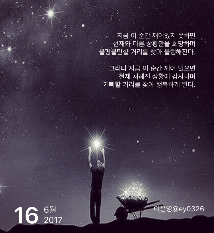 지금 이 순간 깨어있지 못하면현재와 다른 상황만을 희망하며불평불만할 거리를 찾아 불행해진다.그러나 지금 이 순간 깨어 있으면현재 처해진 상황에 감사하며기뻐할 거리를 찾아 행복하게 된다.