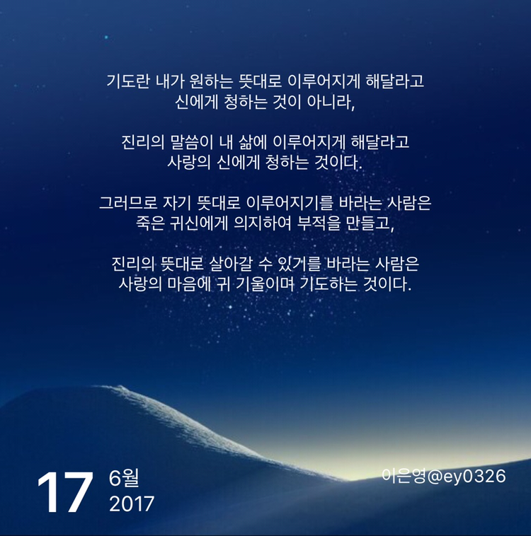 기도란 내가 원하는 뜻대로 이루어지게 해달라고 신에게 청하는 것이 아니라,진리의 말씀이 내 삶에 이루어지게 해달라고 사랑의 신에게 청하는 것이다.그러므로 자기 뜻대로 이루어지기를 바라는 사람은 죽은 귀신에게 의지하여 부적을 만들고,진리의 뜻대로 살아갈 수 있기를 바라는 사람은 사랑의 마음에 귀 기울이며 기도하는 것이다.