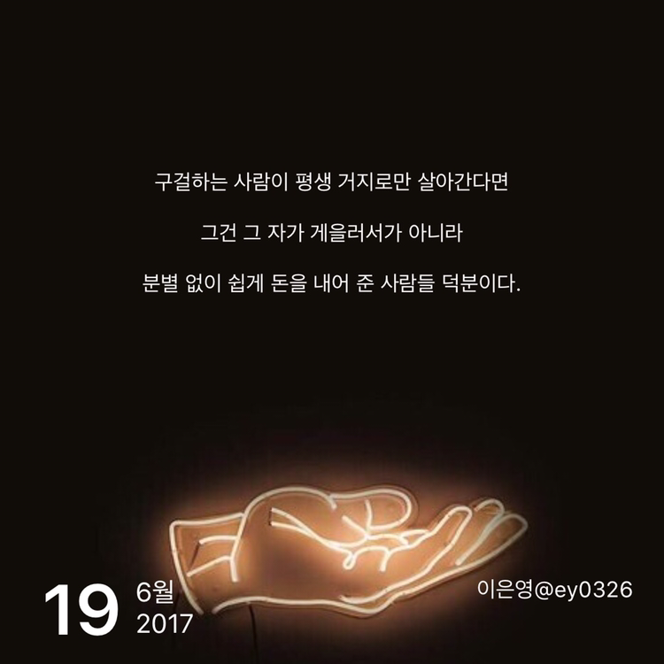 구걸하는 사람이 평생 거지로만 살아간다면그건 그 자가 게을러서가 아니라분별 없이 쉽게 돈을 내어 준 사람들 덕분이다