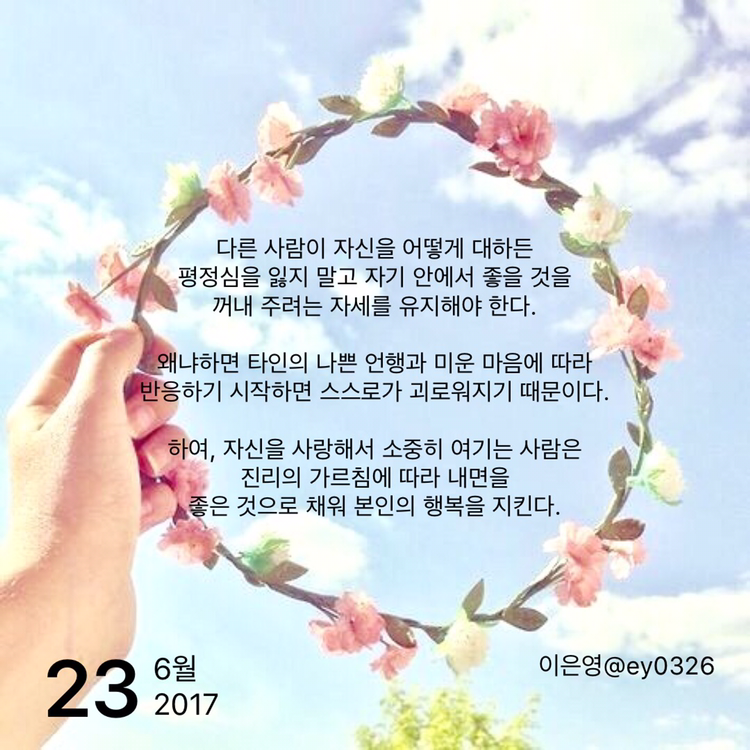 다른 사람이 자신을 어떻게 대하든 평정심을 잃지 말고 자기 안에서 좋을 것을꺼내 주려는 자세를 유지해야 한다.왜냐하면 타인의 나쁜 언행과 미운 마음에 따라 반응하기 시작하면 스스로가 괴로워지기 때문이다.하여, 자신을 사랑해서 소중히 여기는 사람은진리의 가르침에 따라 내면을 좋은 것으로 채워 본인의 행복을 지킨다.