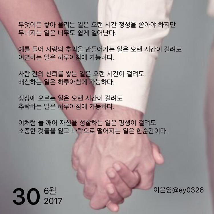 무엇이든 쌓아 올리는 일은 오랜 시간 정성을 쏟아야 하지만 무너지는 일은 너무도 쉽게 일어난다.