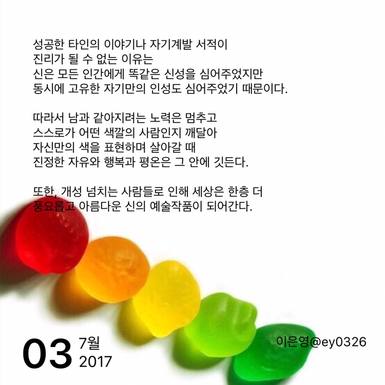 또한, 개성 넘치는 사람들로 인해 세상은 한층 더 풍요롭고 아름다운 신의 예술작품이 되어간다.
