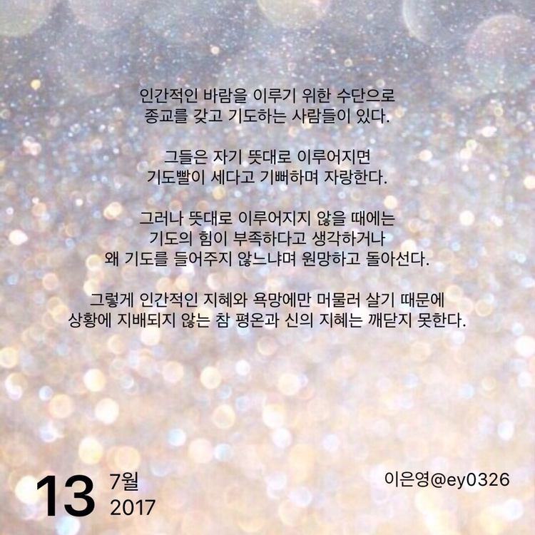 인간적인 바람을 이루기 위한 수단으로종교를 갖고 기도하는 사람들이 있다.그들은 자기 뜻대로 이루어지면 기도빨이 세다고 기뻐하며 자랑한다.그러나 뜻대로 이루어지지 않을 때에는기도의 힘이 부족하다고 생각하거나왜 기도를 들어주지 않느냐며 원망하고 돌아선다.그렇게 인간적인 지혜와 욕망에만 머물러 살기 때문에상황에 지배되지 않는 참 평온과 신의 지혜는 깨닫지 못한다.