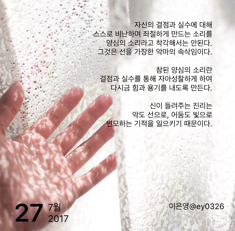 자신의 결점과 실수에 대해스스로 비난하며 좌절하게 만드는 소리를양심의 소리라고 착각해서는 안된다.그것은 선을 가장한 악마의 속삭임이다.참된 양심의 소리란결점과 실수를 통해 자아성찰하게 하여 다시금 힘과 용기를 내도록 만든다.신이 들려주는 진리는 악도 선으로, 어둠도 빛으로 변모하는 기적을 일으키기 때문이다.