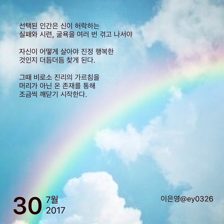 선택된 인간은 신이 허락하는 실패와 시련, 굴욕을 여러 번 겪고 나서야자신이 어떻게 살아야 진정 행복한 것인지 더듬더듬 찾게 된다.그때 비로소 진리의 가르침을 머리가 아닌 온 존재를 통해조금씩 깨닫기 시작한다.