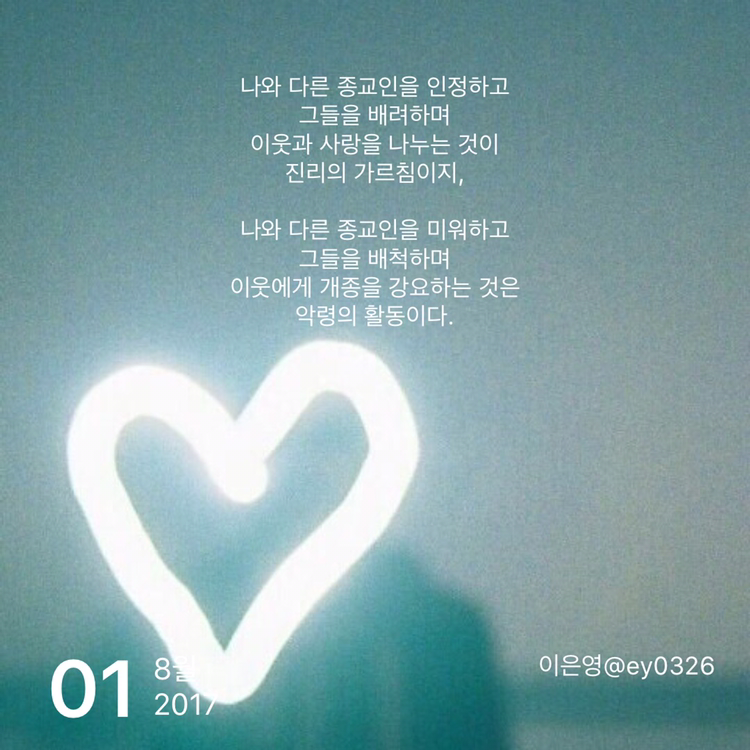 나와 다른 종교인을 인정하고그들을 배려하며이웃과 사랑을 나누는 것이진리의 가르침이지,나와 다른 종교인을 미워하고그들을 배척하며이웃에게 개종을 강요하는 것은악령의 활동이다.