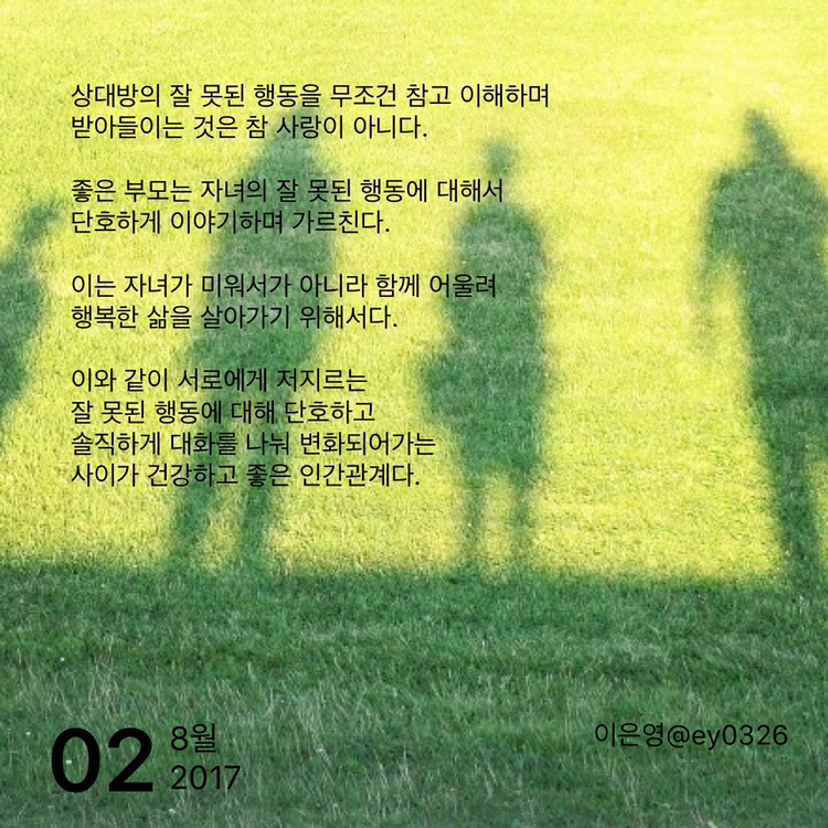 상대방의 잘 못된 행동을 무조건 참고 이해하며 받아들이는 것은 참 사랑이 아니다.좋은 부모는 자녀의 잘 못된 행동에 대해서단호하게 이야기하며 가르친다.이는 자녀가 미워서가 아니라 함께 어울려행복한 삶을 살아가기 위해서다.이와 같이 서로에게 저지르는잘 못된 행동에 대해 단호하고 솔직하게 대화를 나눠 변화되어가는사이가 건강하고 좋은 인간관계다.