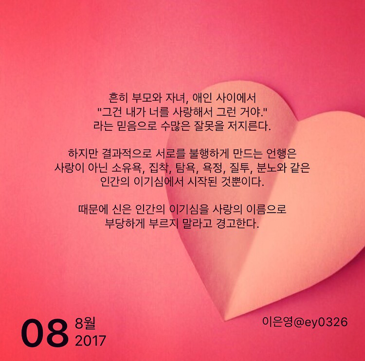 흔히 부모와 자녀, 애인 사이에서 "그건 내가 너를 사랑해서 그런 거야."라는 믿음으로 수많은 잘못을 저지른다.하지만 결과적으로 서로를 불행하게 만드는 언행은 사랑이 아닌 소유욕, 집착, 탐욕, 욕정, 질투, 분노와 같은 인간의 이기심에서 시작된 것뿐이다.때문에 신은 인간의 이기심을 사랑의 이름으로 부당하게 부르지 말라고 경고한다.