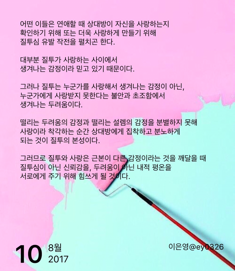 그러나 질투는 누군가를 사랑해서 생겨나는 감정이 아닌, 누군가에게 사랑받지 못한다는 불안과 초조함에서 생겨나는 두려움이다.