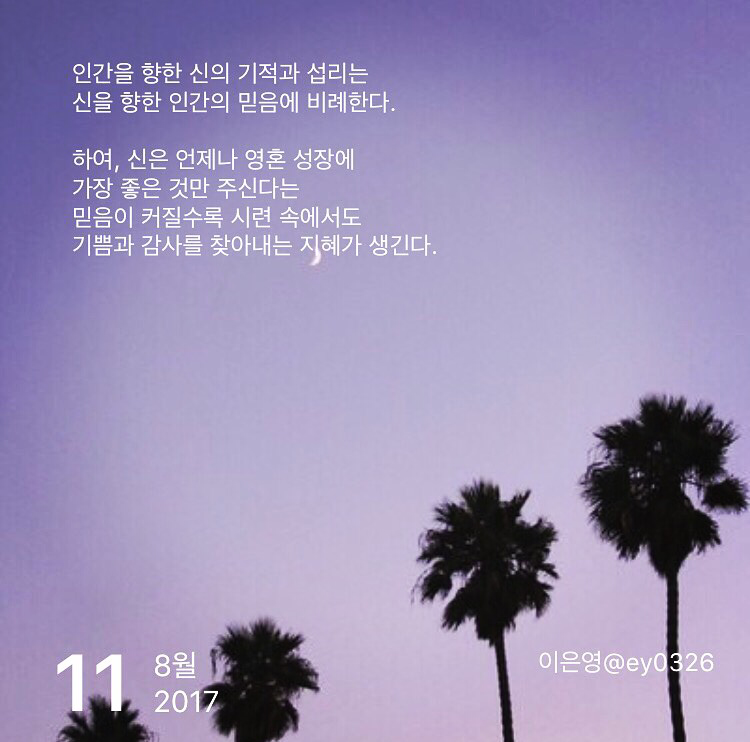 인간을 향한 신의 기적과 섭리는 신을 향한 인간의 믿음에 비례한다.하여, 신은 언제나 영혼 성장에가장 좋은 것만 주신다는 믿음이 커질수록 시련 속에서도 기쁨과 감사를 찾아내는 지혜가 생긴다.